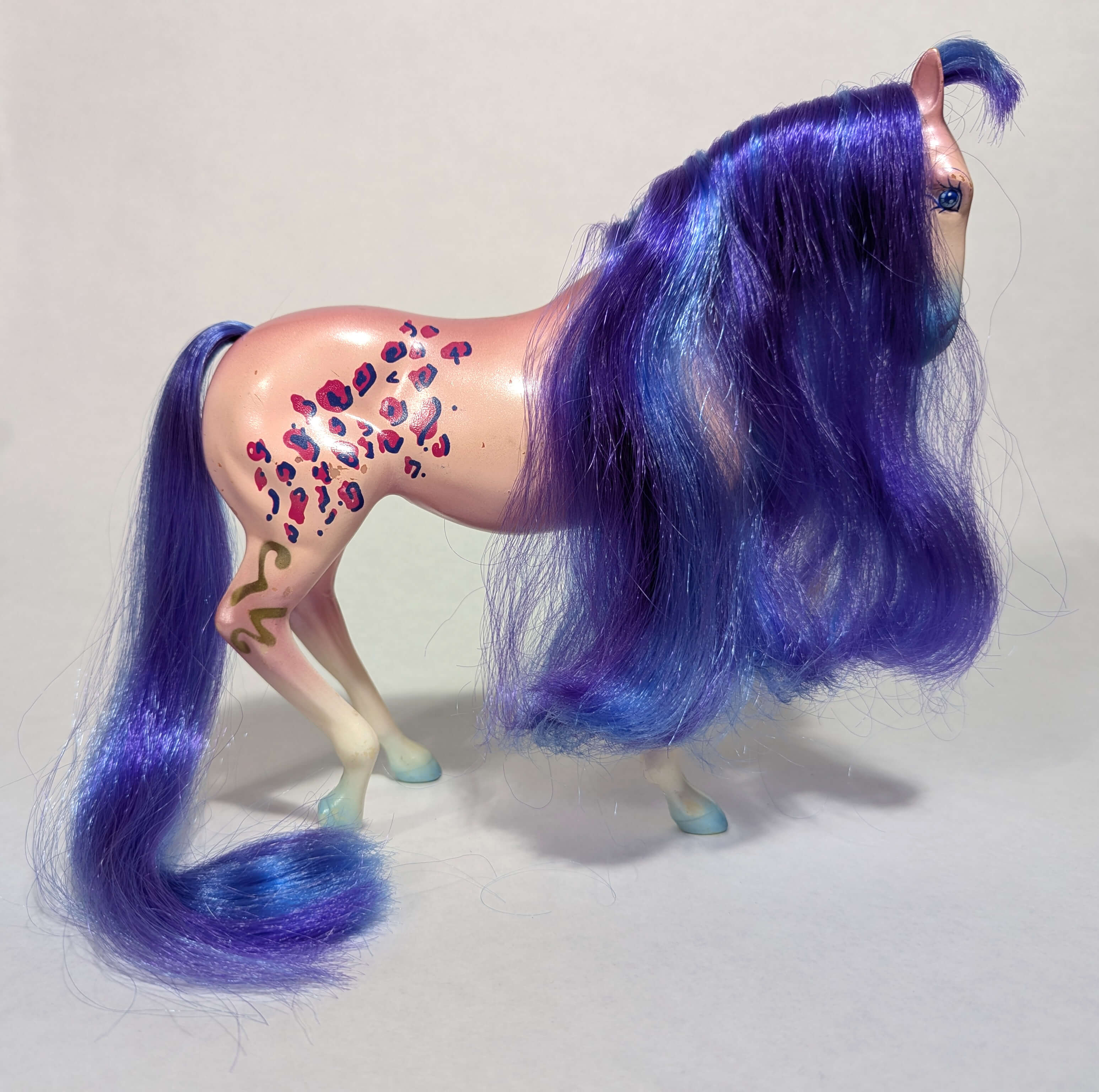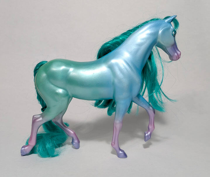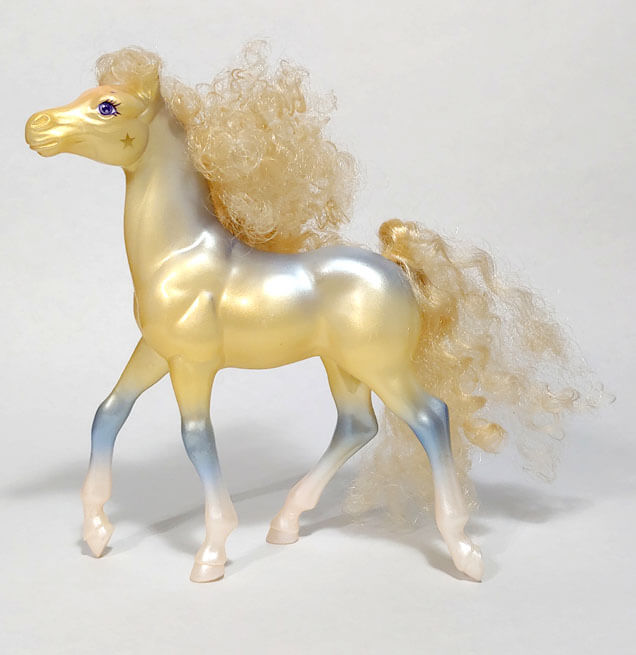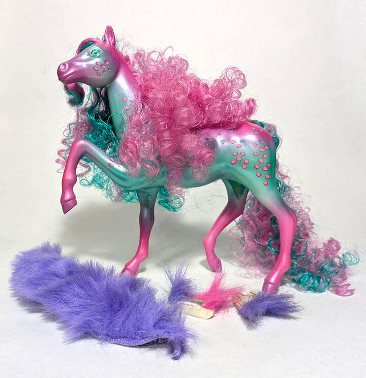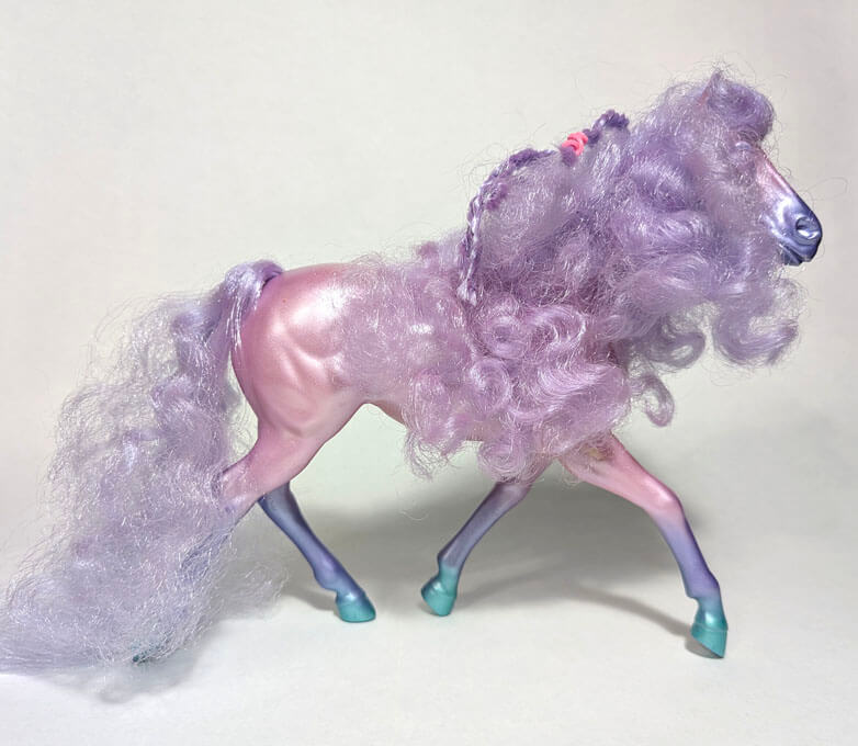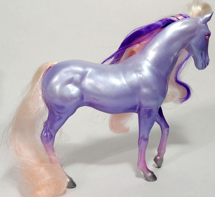 These beautiful and distinctive fashion inclined horses create excitement and demand attention wherever they go. Each horse has a beautiful pearlized body and can be identified by a gold star on their cheek. Cliff, the only stallion, has the golden star on his shoulder. The horses came with numerous fashion accessories and have a personalized brush. Separate outfits could be purchased and many looks and hairstyles could be created!